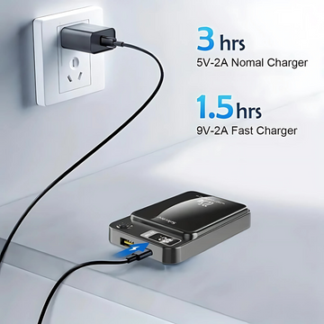 ● Vollständiges Aufladen in 3 Stunden mit einem Standard-5-V-2-A-Ladegerät oder in nur 1,5 Stunden mit einem 9-V-2-A-Schnellladegerät